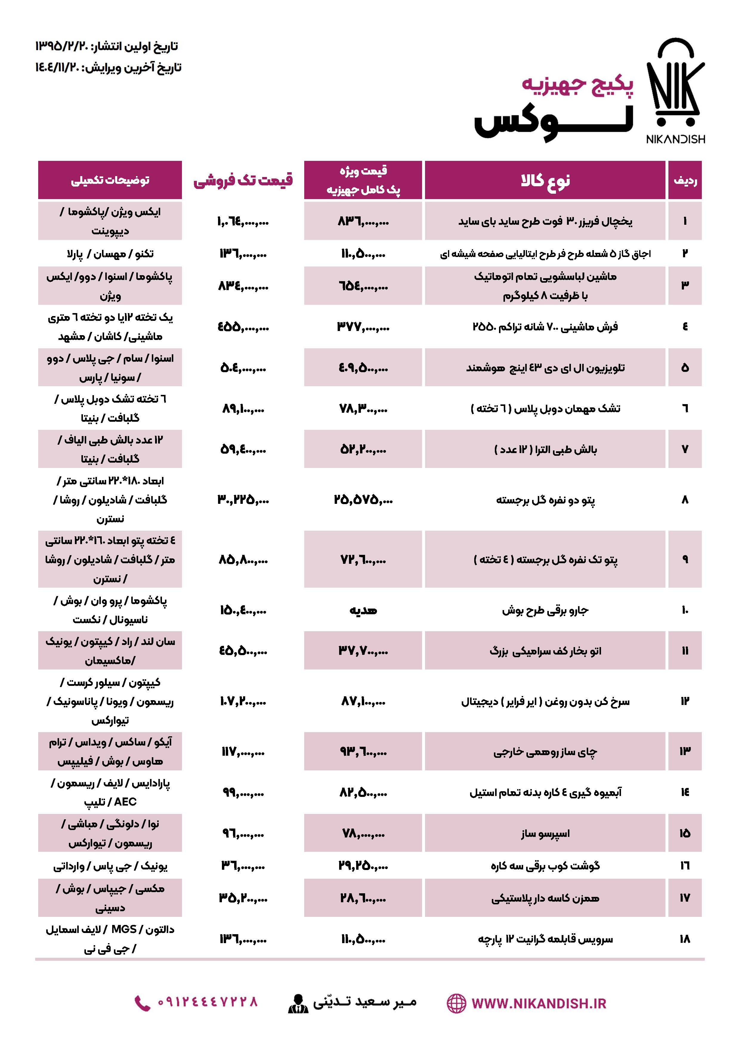 پکیج جهیزیه لوکس نیکاندیش ترکیبی بینظیر از محصولات ضروری مانند یخچالفریزر، ماشین لباسشویی، سرویس چینی و قاشقچنگال، سرویس آشپزخانه، تلویزیون هوشمند، فرش ماشینی، لوازم برقی پرکاربرد، سرویس پذیرایی کریستال و بسیاری اقلام ارزشمند دیگر است که هر کدام بهطور دقیق برای زندگی آرام، زیبا و کاربردی انتخاب شدهاند.