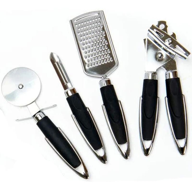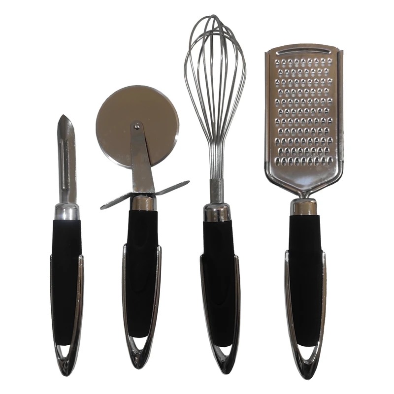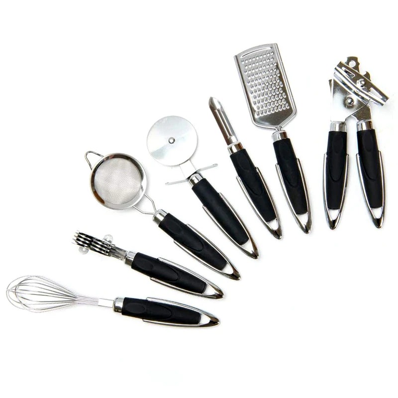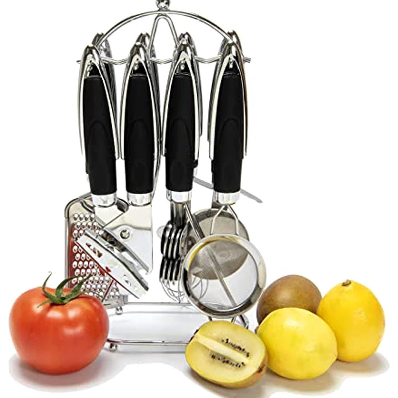 سرویس ۸ پارچه شامل: - صافی، رنده، پوست کن، پیتزا بر، همزن، چاقو تیزکن، درب قوطی بازکن و استند - دسته ساخته شده از استیل ضد زنگ - کیفیت ساخت بالا - قابل شستوشو در ماشین ظرفشویی - طراحی زیبا و بادوام