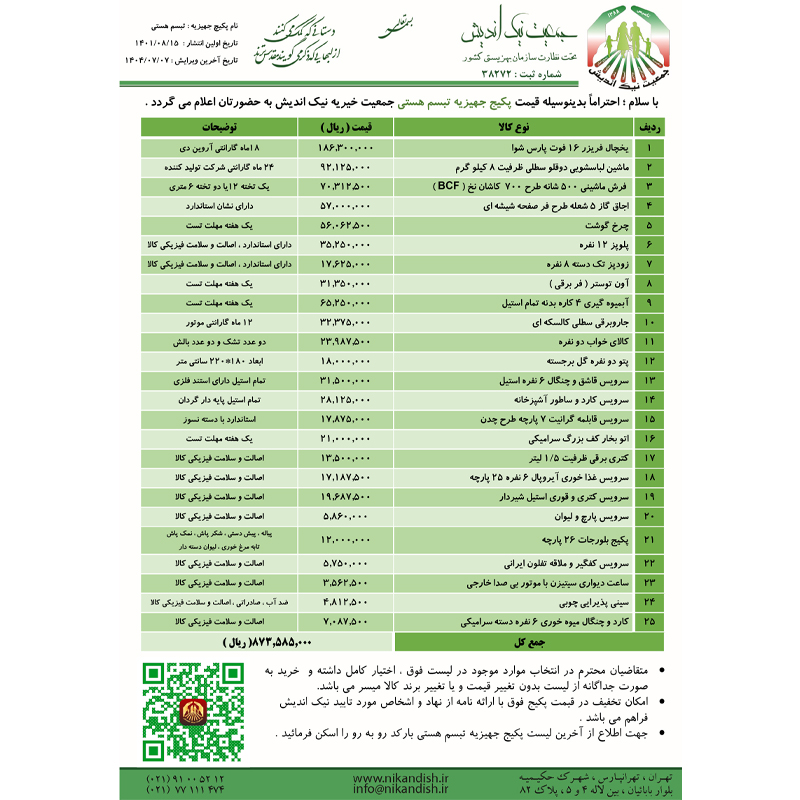 - برای دانلود آخرین ویرایش لیست ریز قیمت اقلام پکیج 21 قلمی تبسم هستی به تاریخ 1404/07/07 کلیک نمایید.